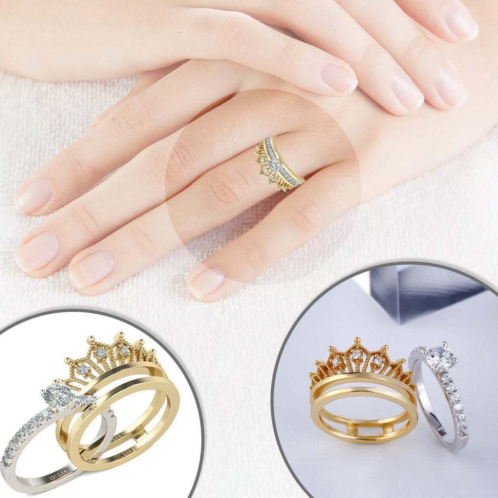 Um anel coroa de princesa trabalhada em material de prata esterlina 925, ródio e banhado a ouro 18k. com pedra de zircônia cúbica de grau AAA impecável, que é uma alternativa de diamante acessível que tem um super brilho e e um corte meticuloso e fino para deixar sua mão bem delicada.